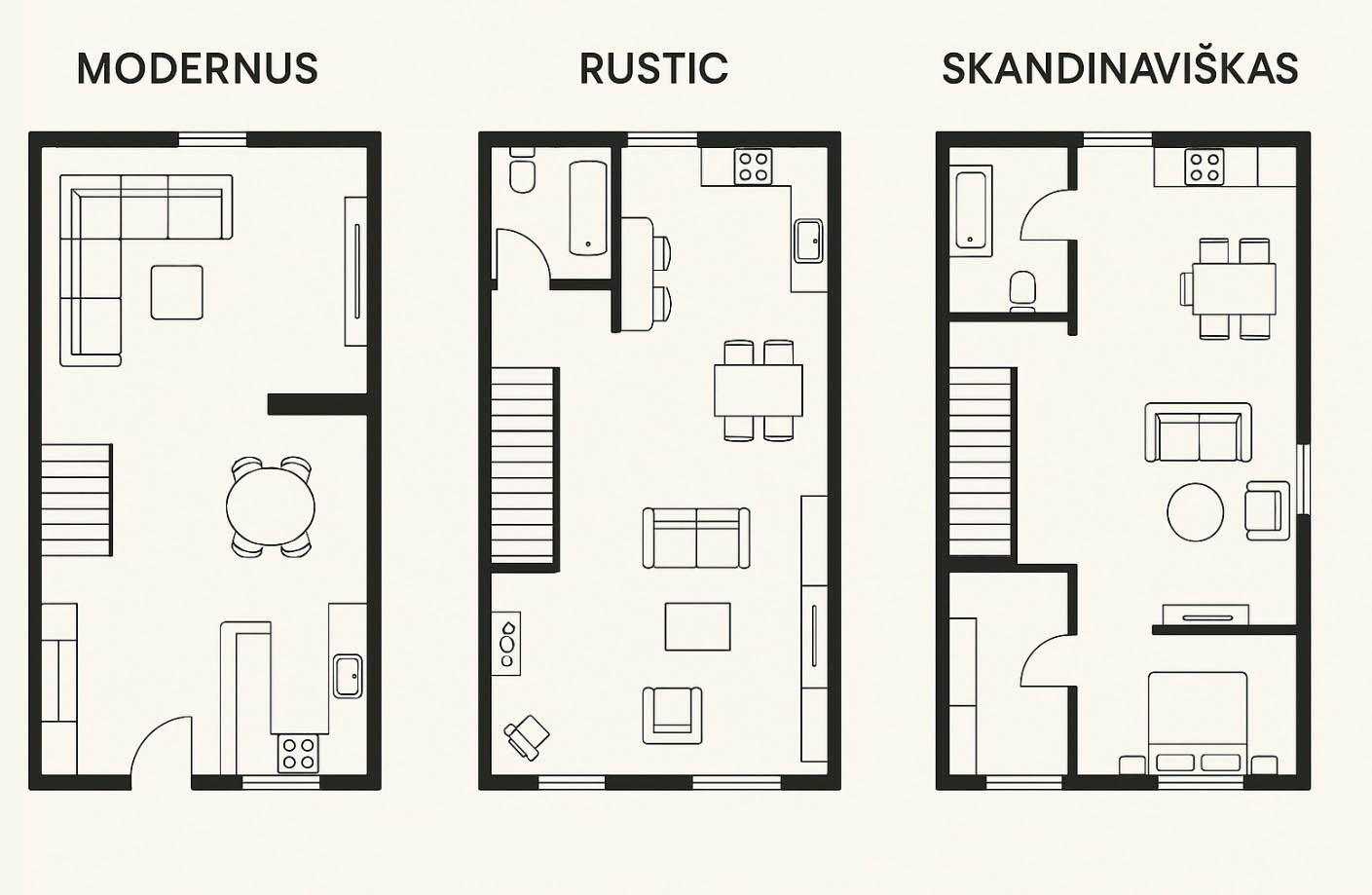 2D kotedžo interjero planai su trimis išdėstymo konfigūracijomis